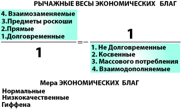 рис.1 На данном рисунке представлены рычажные весы, отражающие двойственность благ. При этом на рисунке показан случай, когда однотипное благо (1-4) в левой части рычажных весов, полностью соизмеримо со своим взаимодополнительным благом в правой части рычажных весов, т.е. эти блага соотносятся между собой по "курсу конвертации" 1:1. 1.2 Долговременные и недолговременные благаЭкономические блага можно разделять на долговременные и недолговременные. От чего зависит это разделение? От срока использования этого блага. Есть блага, которые служат нам долго, и для своих нужд мы можем использовать их не один раз. Например, если мы купим дом, то будем жить в нем не один год, а значит, будем пользоваться этим благом долго. Если мы приобретаем книгу, то после прочтения (использования или потребления этого блага) поставим ее на полку - и она никуда не денется. И книга, и дом - это долговременные блага. Другие блага могут исчезнуть уже в процессе самого потребления, использования этого блага. Например, еда. Мы каждый день потребляем пищу, которая исчезает уже в процессе потребления, в процессе удовлетворения потребности человека в еде. Если мы разводим костер и разжигаем его при помощи спичек, то сожженные спички мы уже не сможем использовать снова. Бутерброд и коробок спичек - это недолговременные блага. Нам одинаково необходимы как долговременные, так и недолговременные, в зависимости от наших текущих нужд и целей использования этих благ. Недолговременные блага мы приобретаем чаще. Долговременные блага - предполагают многоразовое использование. Недолговременные исчезают после (или в процессе) разового использования (потребления). 1.3 Прямые и косвенные благаБлага бывают прямые и косвенные. Что же это значит? Прямые блага (или настоящие) - это уже созданные товары, которые готовы к продаже и потреблению. Косвенными (или будущими) благами называют ресурсы. Потому что благодаря ресурсам только могут быть произведены прямые (настоящие), готовые блага. Например, хлеб - это готовый продукт. А мука, вода и дрожжи - это компоненты для производства (выпечки) хлеба. Эти компоненты -только будущий хлеб, а не готовый продукт, а значит, они являются косвенными благами. Если назначение прямых благ изменить практически невозможно, то косвенные блага могут предназначаться для производства нескольких товаров. Например, те же муку и дрожжи мы можем использовать для выпечки как хлеба, так и сдобных булочек или пирожных. Прямые блага предназначены для непосредственного потребления, поэтому иначе они еще называются потребительскими. Косвенные блага используются в производстве потребительских благ, поэтому иначе они еще называются - производственными или ресурсами. Прямые (потребительские) блага - это готовые для потребления блага. Косвенные (производственные) блага - блага, используемые в процессе производства. 1.4 Предметы роскоши и товары массового потребленияВ тетради Вы пишете авторучкой или карандашом, у многих из Вас есть мобильный телефон или персональный компьютер, Вы носите одежду и т.д. Мы все окружены предметами, необходимыми нам ежедневно и удовлетворяющими наши повседневные потребности. Эта продукция производится массово: у нас похожие ручки и тетради, Вы можете встретить на улице человека в похожей куртке, потому что эти блага производятся фирмами в 