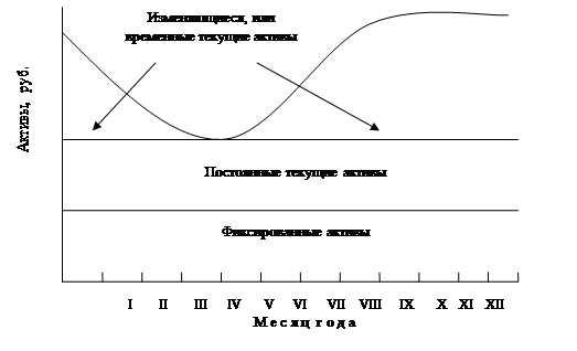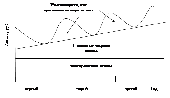 Рис.1.1 Изменение текущих активов фирмы в течение одного года На политику управления оборотным капиталом оказывают влияние три вида активов: 1) временная часть текущих активов, представляющая такой уровень запасов, дебиторской задолженности и денег, который сезонно изменяется; 2) постоянная часть текущих активов - уровень запасов, денег, дебиторской задолженности, который остается неизменным; 3) фиксированные активы - это земля, здания, сооружения, оборудование и другое имущество, которое не может быть продано или заменено в течение длительного периода. Постоянные текущие активы имеют тенденцию к наращиванию. Деньги фирмы увеличиваются с ростом бизнеса, дебиторская задолженность растет с ростом количества покупателей, запасы растут, когда открываются новые возможности. Как меняется величина текущих активов в течение нескольких лет, показано на рис.1.2. Следовательно, перед бизнесом стоят две задачи: сдерживать рост текущих активов, которые изменяются в течение операционного цикла, и управлять постоянными текущими активами, которые растут благодаря долгосрочному росту бизнеса во времени.