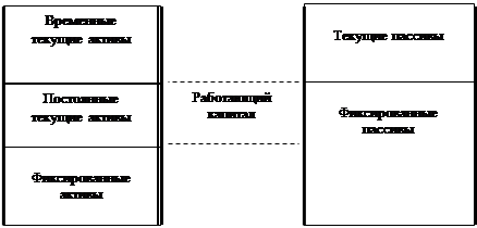 Рис.1.3 Агрессивный подход к финансированию текущих активов Если сравнить текущие активы и текущие пассивы, то будет видно, что все временные текущие активы и большая часть постоянных текущих активов финансируются за счет краткосрочных источников. В результате фирма имеет незначительную величину чистого оборотного, или работающего капитала. В зависимости от природы бизнеса эта незначительная сумма работающего капитала может быть рискованной: нет "воздушной подушки" (буфера) между стоимостью ликвидных активов и суммой долгов, которые надо выплатить в краткосрочном периоде (со сроком погашения менее года). Фирма может быть более агрессивной, чем показано на рис.1.3 Если она финансирует все текущие активы текущими обязательствами, т.е. ее текущие активы равны текущим пассивам, работающий капитал фирмы равен нулю и "подушки" нет вовсе. Менеджеры могут пойти дальше, финансируя часть своих долгосрочных активов (здания, оборудование) краткосрочными источниками и тем самым формируя отрицательный работающий капитал. Это очень рискованно (например, могут неожиданно вырасти процентные ставки по краткосрочным ссудам). Однако менеджеров привлекает агрессивное финансирование, обеспечивающее возможность использовать относительно большие суммы краткосрочных долгов для финансирования текущих активов. Обычно их соблазняют более низкие процентные ставки. Менеджеры будут принимать риск, если ожидаемая рентабельность достаточно высока, что оправдывает этот риск.