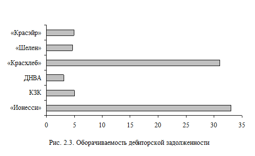 Коэффициент используется для измерения величины денежных активов, доступной для погашения текущих обязательств. Это жесткий тест, игнорирующий возобновляемую природу текущих активов и текущих пассивов. Однако его важность как абсолютной формы ликвидности не может недооцениваться. Мировой опыт банкротств дает множество примеров неплатежеспособности компаний со значительными размерами активов (как текущих, так и фиксированных), неспособных при этом оплачивать свои долги и эффективно функционировать. 2.5 Анализ операционной активностиАнализ ликвидности сопровождается анализом деловой активности, которую характеризуют показатели оборачиваемости дебиторской задолженности, запасов и кредиторской задолженности. Дебиторская задолженность как измеритель ликвидности. Для многих компаний, продающих товары в кредит, дебиторская задолженность является важной частью оборотного капитала. В оценке ликвидности, кроме качества оборотного капитала и коэффициента текущей ликвидности, необходимо также измерять качество и ликвидность дебиторской задолженности. И качество, и ликвидность дебиторской задолженности находятся под влиянием уровня ее оборачиваемости. Качество определяется вероятностью инкассации без потерь. Опыт показывает, что чем дольше дебиторская задолженность просрочена, тем ниже вероятность ее инкассации. Оборачиваемость - это индикатор возраста дебиторской задолженности, особенно полезный при сравнении с ожидаемым показателем оборачиваемости, который рассчитывается на основании установленных фирмой кредитных условий. Ликвидность дебиторской задолженности означает скорость ее конвертации в деньги. Оборачиваемость дебиторской задолженности есть мера этой скорости. Рис.2.3 иллюстрирует скорость оборота дебиторской задолженности известных красноярских компаний.