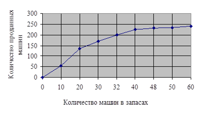 Рис.5.1 График зависимости продаж от уровня запасов Используя модель EOQ , определим число автомобилей, которое надо заказывать оптовым дилерам, когда требуется пополнить запасы[4] : EOQ