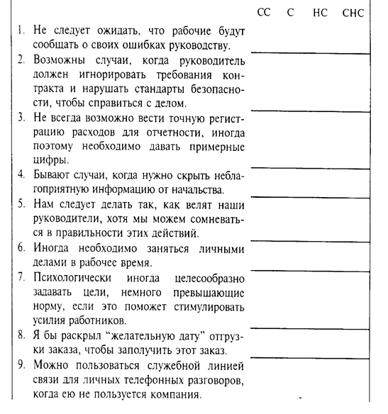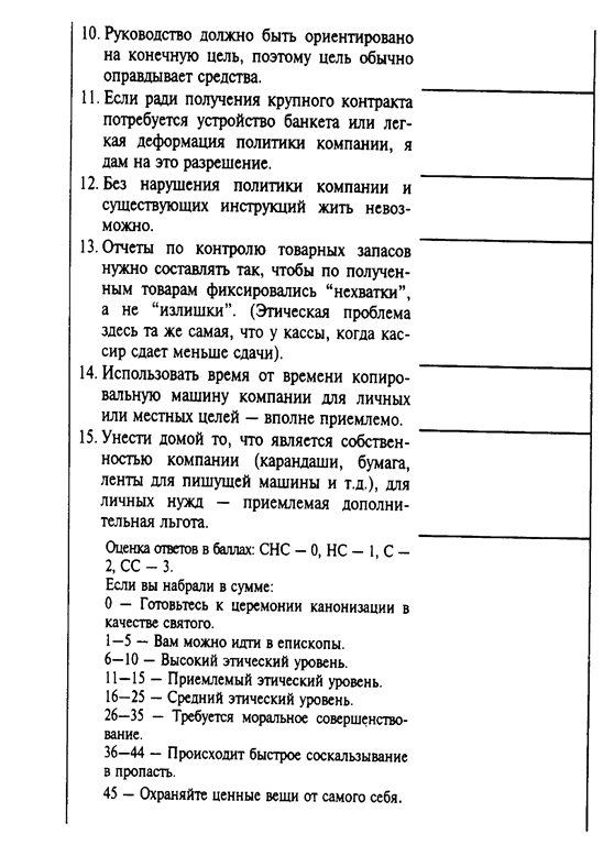 Повышение уровня этики делового общения. Существуют различные средства и способы повышения уровня моральности делового общения. В качестве примеров повышения показателей этичности поведения как руководителей, так и рядовых работников можно привести следующие: разработка этических нормативов на предприятии, создание комитетов и комиссий по этике, проведение социально-этических ревизий, обучение этическому поведению. Этические нормативы делового общения и поведения должны описывать общую систему и правила этики, которых, по мнению организации, должны придерживаться ее работники. Эти нормативы разрабатываются с целью улучшить деловое общение на различных уровнях и в разных сферах деятельности организации. Цель их создания — установление нормальной нравственной атмосферы и определение этических рекомендаций при принятии решений. Каждое предприятие, если оно дорожит своей репутацией, будет стремиться к тому, чтобы утвердить у себя высшие стандарты этики делового общения, являющейся важнейшим компонентом бизнеса. Так, при заключении сделок и других видов делового общения этическими нормативами обычно запрещаются взятки, "подмазки", вымогательство, подарки, мошенничество, нарушение законов, незаконные выплаты политическим организациям и т.д. На Западе организации обычно доводят этические нормативы до своих работников в виде печатных материалов. Некоторые фирмы создают рабочие группы или постоянные комитеты по этике. Другие нанимают специалиста по этике бизнеса, называемого адвокатом по этике. Его роль сводится к выработке суждений по этическим вопросам, в том числе и по этике делового общения. В России, к сожалению, этике делового общения и вообще этике бизнеса не придается пока должного внимания. Применительно к бизнесу на международном уровне следует иметь в виду, что в некоторых странах правительственные чиновники привыкли и ждут небольших денежных подношений. По мнению специалистов, видимо, настала пора заняться разработкой этических нормативов, применяемых во всем мире, и обеспечить уход с сомнительного рынка любого субъекта при возникновении крупных неразрешаемых этических проблем. Задача повышения норм и стандартов этики делового общения, как и вообще этики бизнеса, во многих странах сегодня выдвигается как одна из важнейших. Проблема стоит достаточно остро. Так, согласно опросам общественного мнения, среди широких слоев населения США господствует убеждение, что ценности этического поведения неуклонно снижаются. В России, как это признается повсеместно, положение с этим еще хуже. Поэтому организации, фирмы, руководители и предприниматели всех уровней должны приложить максимум усилий для повышения этичности делового общения, используя для этого различные способы и средства, в том числе и обучение этике делового общения. Вопросы для повторения1. Дайте определение понятий "этика", "общение", "деловое общение", "этика делового общения". 2. Каковы особенности этики делового общения традиционного общества? 3. Назовите основные позиции по вопросу о соотношении этики и бизнеса, которые существуют сегодня. 4. Какова, по вашему мнению, роль этики в деловом общении? 5. Назовите основные принципы этики делового общения "сверху-вниз" (между руководителем и подчиненным). 6. Назовите основные принципы этики делов