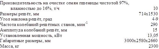 Основные узлы машины: рама, приемно-питающее устройство, воздушная система с двумя каналами аспирации, верхний и нижний решётные станы с механизмами очистки решёт, механизмы управления и контроля, вентилятор и привод. Подача материала в приёмно-питающее устройство машины производится, устанавливается и регулируется норией. Зерноочистительные машины ЗВС020А и ЗАВ-10.30.000 Машины стационарные. Применяются для первичной очистки вороха зерновых, зернобобовых, бобовых, крупяных и масличных культур. Таблица 4.1 Техническая характеристика
