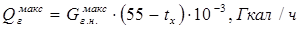 Q г макс = 6,2125 * 50 * 0,001 = 0,310625 Гкал/ч = 360,325 кВт, где 55 – принятая температура горячей воды;