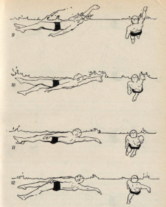 1.Левая рука входит в воду прямо за плечом. Первым погружается мизинец. Правая рука заканчивает гребок и начинает движение вверх. 2.Количество движения, приобретенное во второй половине движения руки чад водой, вызывает погружение прямой руки в воду. Правая кисть начинает движение вверх одновременно с левой стопой. Такое согласование движений наблюдается у большинства квалифицированных пловцов. 3.Правая рука выходит из воды, при этом запястье сгибается.