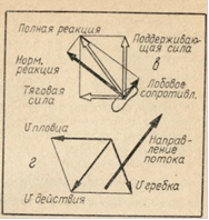 5. Силы, вызывающие плавание способом "кроль на спине", их происхождение и взаимодействиеСпособы плавания основаны на взаимодействии пловца с водой, при котором создаются силы, продвигающие его в воде и удерживающие на ее поверхности. Взаимодействие возникает вследствие погружения тела в воду и активных движений пловца. Специфические особенности биодинамики плавания связаны с тем, что силы, тормозящие продвижение, значительны, переменны и действуют непрерывно. У пловца нет постоянной опоры для отталкивания вперед. Она создается во время гребковых движений. В настоящей главе излагаются условия создания сил и движущих, и тормозящих, а также механизм гребковых действий пловца, направленных на более эффективное передвижение в воде. Взаимодействие тела пловца с водой. Погружение в воду обусловливает возникновение сил статического взаимодействия (выталкивающая сила). Активные движения пловца и продвижение его в воде вызывают силы динамического взаимодействия (лобовое сопротивление, подъемные силы). Следовательно, положение тела пловца в воде и его движения обусловливают всю совокупность сил, которые решающим образом определяют эффективность плавания. Статическое действие водной среды. Силы, приложенные к плавающему телу. Погруженное в воду тело пловца находится под действием погружающей и выталкивающей сил; при их равенстве тело не всплывает и не тонет. Погружающая сила - это сила тяжести тела, направленная вниз и приложенная к его ОЦТ. Выталкивающая сила возникает по закону Архимеда: она обусловлена разностью давлений воды на нижнюю и верхнюю поверхности погруженного тела. По величине она равна весу воды в объеме погруженной части тела. При более глубоком и полном погружении выталкивающая сила растет. По мере поднимания над водой частей тела (например, во время движения руки по воздуху перед гребком) выталкивающая сила уменьшается. Она направлена снизу вверх и приложена к центру объема тела, если все тело полностью погружено в воду. Если тело погружено в воду не полностью, то выталкивающая сила приложена к центру объема погруженной части всего тела. Рис.5. Уравновешивание тела пловца в воде: а - отсутствие равновесия; б - уравновешенное положение; в - образование тяговой силы; г - образование скорости гребущей поверхности (действия) на воду