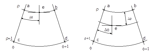 Рисунок 2. Интерполяция цифровых отсчетов. Понятно, что если точка е находится посредине между точками а и b, то отсчет е равен их полусумме. В общем случае, показанном справа, информация, которая должна быть присвоена точке е, определяется отсчетами всех четырех точек полярной системы: