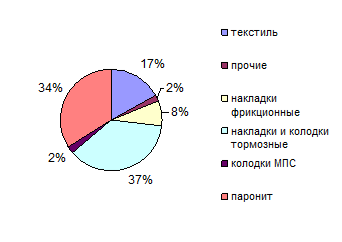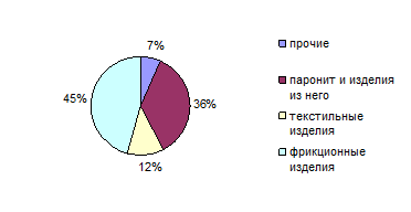 Продукция и рынки: из всего номенклатурного ряда асбестотехнических изделий, выпускаемых предприятиями отрасли, Барнаульский завод АТИ имеет широкую номенклатуру по паронитовым изделиям (от 35 до 75%) и текстильной продукции (до 100 % номенклатуры), а также накладкам и колодкам тормозным (до 15%), накладкам и секторам фрикционным формованным (до 20%), лентам тормозным тканым (37%) и вальцованным (28%). По 17 номенклатурным группам (~ 50 % всей номенклатуры асбестотехнических изделий отрасли) предприятие не производит изделий. В тоже время по ряду изделий БзАТИ является единственным в отрасли производителем, однако номенклатура таких изделий очень узкая (колодки тормозные для тракторов, буровых установок, секторы и вкладыши фрикционные для различных тормозных устройств). По итогам 2005 г. анализируемое предприятие произвело ~ 12 % и реализовало ~ 10,5 % продукции отрасли, серьезно отставая по этому показателю от лидеров отрасли заводов ФРИТЕКС, УралАТИ, ВАТИ. На рисунок 9 представлена структура товарного выпуска, а на рисунок 10 структура отгруженной продукции (данные 2005 г.)