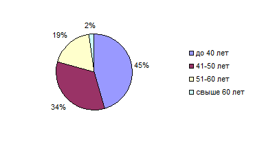 Рисунок 18 Структура персонала БзАТИ (1 кв. 2006 г.). Возрастная структура (рисунок 19) довольно благоприятная: ~80% персонала находится в активной фазе жизненного цикла (до 50 лет). Вместе с тем обращает внимание неблагоприятная структура ведущих специалистов технических служб отделов и цехов предприятия, а также высокий коэффициент текучести, существенно превышающий среднеотраслевой уровень.