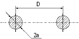 Полученные значения позволяют оценить рассогласование фильтра с антенной в рабочем диапазоне длин волн. 8. Выбираем фидерную линию. Тип фидера проектируемой антенны открытый, симметричный, двухпроводный (рисунок 14). Волновое сопротивление фидера Wф выбирается по известному входному сопротивлению антенны на рабочей частоте, то есть: Wф = Rвх (λср). Для передающих антенн фидер выполняется из проводов диаметром 3 ... 6 мм, расстояние между проводами обычно составляет 225 ... 450 мм. В данном случае фидер выполнен из: провода диаметром в = 2a = 6 мм, то есть: расстояние между проводами: Волновое сопротивление двухпроводной линии определяется по формуле: