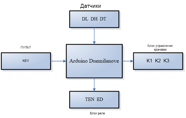 Рисунок1. Структурная схема устройства Используемые сокращения: 1)DL – Датчик нижнего уровня; 2) DH - Датчики верхнего уровня ; 3) DT - Датчик температуры; 4)K1, K2, K3 – электромагнитные краны ; 5)TEN – электрический нагревательный элемент; 6) Arduino Duemilanove – платформа Arduino Duemilanove.