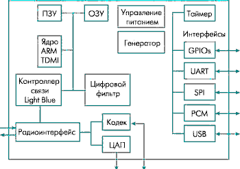 Рис. 1.1. Наиболее обобщенная структурная схема приемопередатчика (трансивера) с контроллером информационного тракта приведена на рис. 1.1. Она включает функции, перечисленные выше. Варианты внутренней структуры контроллера информационного тракта приведен на рис. 1.2. Это упрощенная структура ИМС PCD87550 фирмы Филлипс, которая является контроллером информационного тракта цифровых радиопередатчиков системы беспроводной передачи данных «Bluetooth» (рис. 1.2.а) и структурная схема baseband-контроллера AD6526, предназначенного для построения трансиверов стандартов GSM/GPRS (рис. 1.2б). Вычислительным ядром этих контроллеров является специализированный процессор ARM TDMI, управляющий контроллером связи, который, в свою очередь, через радиоинтерфейс управляет работой трансивера, получает и передает через него данные. Под радиоинтерфейсом здесь имеется в виду схема сопряжения цифрового контроллера связи с аналоговой частью трансивера. Остальные блоки, показанные на рис. 1.2а, особых пояснений не требуют: это кодек речи, ЦАП для управления режимами каскадов трансивера, внутренний тактовый генератор, память, интервальный таймер, а также богатый выбор интерфейсов для связи с периферийными устройствами (например, дисплеем, клавиатурой) и внешним управляющим компьютером. Контроллер AD6526 является более специализированным, поэтому в него введены такие блоки, как интерфейс SIM-карты, интерфейсы дисплея, клавиатуры и подсветки, часы реального времени и др. Его блоки можно разделить на три основные группы: подсистема управляющего микропроцессора (MCU), подсистема сигнального процессора (DSP), подсистема периферии.