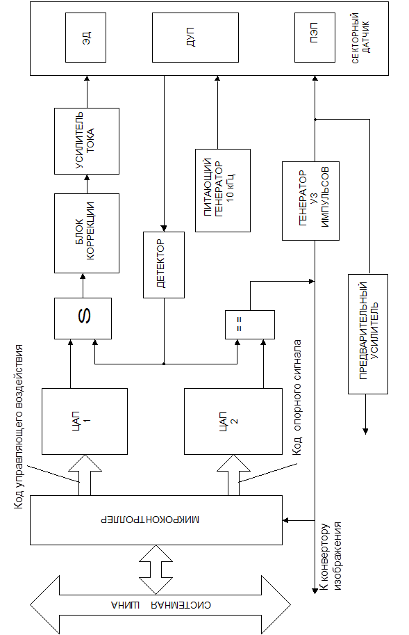 Из-за их большого количества часть функций она делегирует местным МПС – микроконтроллерам, работа которых инициируется при запуске программы главной МПС, и в дальнейшем они работают автономно. Приведенная структурная схема достаточно условна и может быть изменена, например, экранное ОЗУ может быть включено в конвертор изображения и т.п. 1. Блок управления механическим секторным датчиком Несмотря на относительную простоту механического датчика его блок управления достаточно сложен. Это объясняется прежде всего тем, что датчик является инерционной системой и управляющее воздействие на двигатель не может однозначно определять угловое положение пьезопреобразователя. Движение вращающихся частей датчика описывается дифференциальным уравнением второго порядка