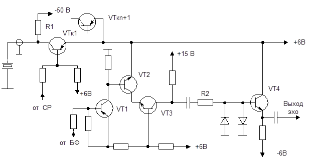 Рисунок 7.Управляющие импульсы Пока ни один из импульсов СР и БФ не поступил, все транзисторы в схеме закрыты. Пьеоэлемент заряжен от источника – 50 В через резистор с большим сопротивлением (около 20 кОм). Импульс СР подготавливает транзистор VTк к открытию. Полностью он откроется, когда придет импульс БФ. При этом откроются транзисторы VT1-VT3, и ток транзистора VT2 пройдет через VTк. Его ток быстро разрядит ПЭП, что вызовет колебания кристалла. Этот же ток создаст большой импульс на коллекторе VT3. Для его ограничения применяют двухсторонний диодный ограничитель (диоды и резистор R2). Тем не менее, этот импульс получается намного больше нормального эхо-сигнала, что вызывает перегрузку общего усилителя (в нем на этот случай также предусмотрены ограничители) и довольно длительный переходный процесс. Прием эхо-сигналов в это время невозможен, и, значит, УЗ информация из некоторой приповерхностной области будет потеряна. Эта область называется мертвой зоной . Ее протяженность составляет 20-30 мм. Сдвиг фронта импульса БФ относительно СР вырабатывается блоком фокусировки луча для каждого канала в отдельности в соответствии с алгоритмом фокусировок. От начала импульса БФ и до конца строки транзисторVTк остается открытым и пропускает в обратном направлении эхо-сигналы. Они усиливаются транзисторами VT2 и VT3, которые для эхо-сигналов представляют каскодный усилитель. К каналу приемо-передатчика подключено несколько транзисторов VTк, которые коммутируют элементы пьезорешетки с периодом n. На рис.6 – это VTк1, VTкn+1, VTк2n+1 и т.д. Однако на каждой УЗ строке импульсом от сдвигающего регистра из них выбирается только один. 4. Блоки фокусировок