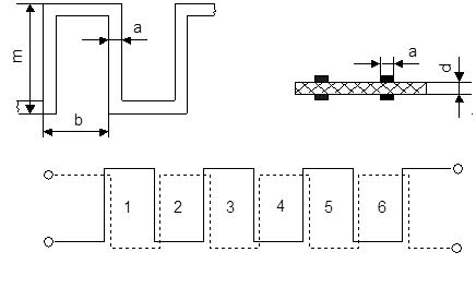 Рисунок 11. Полосковая линия задержки Она выполняется фотогальваническим способом из двухстороннего фольгированного стеклотекстолита и состоит из двух зигзагообразных дорожек (меандров), сдвинутых на половину пространственного периода. Распределенные емкость и индуктивность такой линии определяются толщиной стеклотекстолита, шириной дорожек и размерами окна. Индуктивность и емкость одного звена рассчитываются по формулам