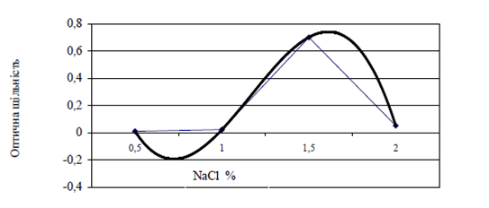 Рисунок 6 – Залежність кольоровості розчину, виготовленого з осаду від концентрації солі в ньому Таким чином, осад виділеного барвника можна використовувати, розчиняючи його лише у воді та сиропах. Це свідчить про те, що барвник має домішки інших барвних сполук і потребує додаткового очищення. Термічна обробка розчинів, забарвлених виділеним меланіновим барвником (випробовували температуру до 105 0С) не змінює забарвлення. ВисновокГромадське харчування - сфера виробничо-торгової діяльності, у якій виробляють і продають продукцію власного виробництва і покупні товари, як правило, призначені для споживання на місці, з організацією дозвілля чи без нього. Діяльність у цій сфері здійснюється закладами громадського харчування, що представляють собою організаційно-структурні одиниці, що, виробляють, довиготовляють і продають кулінарну продукцію, булочні, борошняні кондитерські вироби і покупні товари. Самостійний заклад громадського харчування чи сукупність таких закладів, що входять до складу одного суб'єкта господарювання (юридичної особи), являють собою підприємство громадського харчування. Технології виробництва барвників, що проте існують на сьогоднішній день, з плодів бузини і глоду мають ряд недоліків (енергоємність, трудомісткість, тривалість процесу екстракції) і вимагають удосконалення на базі використання сучасних прийомів виробництва. Для підбарвлення продуктів харчування використовуються барвники, які містять в собі природні пігменти рослинного або тваринного походження - природні барвники.Таким чином, удосконалення та розробка нових методів виробництва мелані-нових барвників з натуральної сировини, з метою збільшення об’ємів їх використання під час виготовлення продуктів харчування, є актуальною проблемою, вирішення якої дасть можливість поліпшити їх якість та харчову цінність. У харчовій промисловості барвники застосовуються для багатьох продуктів з метою надання їм привабливішого зовнішнього вигляду. Зазвичай забарвлюються кондитерські вироби, безалкогольні напої, лікери, сири, масло, маргарин, макарони, деякі м'ясні продукти і ін. Для фарбування харчових продуктів можуть застосовуватися тільки абсолютно нешкідливі барвники. У різних країнах застосовуються різні харчові барвники. Їх номенклатура за останні 10–15 років скоротилася в 4—5 разів; приблизно з 80 до 20 найменувань. Сюди входять барвники всієї гами квітів, а саме: червоні, оранжеві, жовті, зелені, блакитні, чорні та інші, що дає широку можливість вибору [11]. У подальшому необхідно, доопрацювавши випробувані нами технології отримання натурального меланінового барвника, обрати оптимальну не тільки з точки зору органолептичних та фізико-хімічних показників, але й економічної доцільності виробництва; розробити науково-технічну документацію на виробництво харчового барвника і рекомендації його до впровадження у виробництво для забарвлення в коричневі тони безалкогольних напоїв, тіста, кремів та інших продуктів. Список використаних джерел1. Санітарні правила по застосуванню харчових добавок [Текст]: від 23 липня 1996р. № 222 // Збірник важливих офіційних матеріалів. – К., 1997. – С. 122 - 184. 2. А. с. 939446 СССР. Способи отримання пігменту – барвника з рослинної сировини [Текст]. – С09 В61/00, 1980. 3. А. с. 1055749 СССР. Способи отримання пігменту – барвника з рос