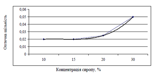 Рисунок 5 – Залежність кольоровості розчину, виготовленого з осаду екстракту, від концентрації цукру в ньому