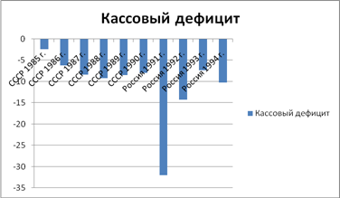 Рис. 2.5 Дефицит бюджетов СССР и России в период с 85-ого по 94-ый гг. Как видно из рис.2.5, самый серьезный кассовый дефицит возник в 1991 году. Расходы бюджета резко превышали доходы в период распада СССР и экономического кризиса. Государство было вынуждено поддерживать рушившуюся экономику новыми расходами, но из-за того, что часть территорий отделилась, у них сформировался собственный бюджет, страна потеряла значительную часть доходов в казну. И, как мы видим из табл.2.4, на протяжении всего исследуемого периода экономике страны так и не удалось выйти из дефицита бюджета. Табл. 2.4 Динамика доходов и расходов бюджетов СССР и России в период с 85-ого по 94-ый гг.