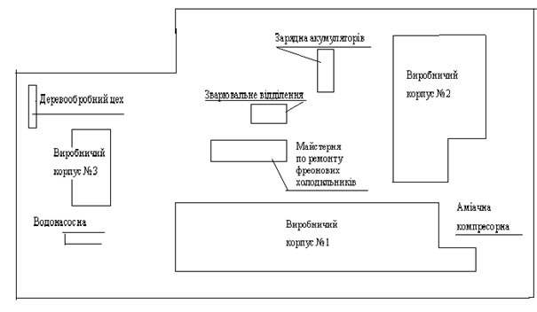 Рисун о к 2.2 - Карта-схема розміщення джерел викидів ЗАТ «Юрія» Як видно з рисунка основними стаціонарними джерелами викидів є виробничі корпуси, деревообробний цех, зварювальне відділення, Дільниця зарядки акумуляторів та майстерня по ремонту фреонових холодильників. Перелік джерел виділення існуючих на підприємстві забруднень представлено в таблиці 2.3. Таблиця 2.3. - Перелік джерел викидів, етапів технологічної праці та їх параметрів