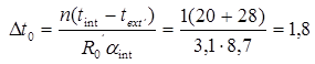 где n - коэффициент, учитывающий зависимость положения наружной поверхности ограждающих конструкций по отношению к наружному воздуху и определяемый по СНиП 23-02-2003. Для наружных стен n =1. ∆tn - нормируемый температурный перепад между температурой внутреннего воздуха tint и температурой внутренней поверхности ограждающей конструкции, принимаемый по СНиП 23-02-2003. Для наружных стен ∆tn =4. αint - коэффициент теплоотдачи внутренней поверхности ограждающих конструкций, Вт/(м ×°С), принимаемый по СНиП 23-02-2003 мы получаем αint =8,7 Вт/(м ×°С). tint - расчетная средняя температура внутреннего воздуха здания, °С, принимаемая для расчета по СНиП 23-02-2003 по минимальным значениям оптимальной температуры соответствующих зданий по ГОСТ 30494. tint =23°С. text - расчетная температура наружного воздуха в холодный период года, °С, для всех зданий, предназначенных для сезонной эксплуатации, принимаемая равной средней температуре наиболее холодной пятидневки обеспеченностью 0,92 по СНиП 23-01-99*. text = -28°С. R0 - приведенное сопротивление теплопередаче ограждающих конструкций, м2. °С/Вт.