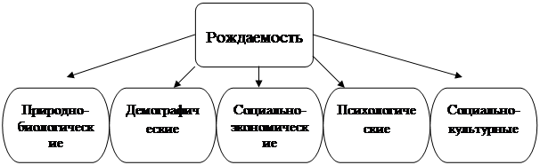 Рис. 1. Схема факторов, влияющих на рождаемость населения. Составлено автором по источнику Большое влияние на смертность оказывают войны. По подсчетам демографов войны унесли 4 млрд. человек. Так же на показатели смертности влияет уровень благосостояния общества: чем выше экономическое развитие, тем лучше здравоохранение, условия проживания, условия работы => показатели смертности ниже. Смертность зависит от возрастной структуры населения: чем больше лиц старших возрастов, тем выше показатели смертности => в экономически развитых странах, где идет процесс старения наций смертность повышается и, наоборот, в государствах, где доля лиц старшего возраста незначительна, там смертность населения низкая. [3] Изучение вопросов о возрасте и поле населения всегда интересовали экономистов, географов, социологов. Данные о возрастном и половом составе необходимы для подсчета трудовых ресурсов, контингентов детей школьного и дошкольного возраста, численности пенсионеров и избирателей, численности призывников для службы в армии, для планирования выпуска товаров народного потребления. Половая структура – соотношение женского и мужского населения. Соотношение мужчин и женщин – важный показатель, влияющий на демографические процессы, особенно на брачность, рождаемость, естественный прирост. Соотношение мужского и женского населения характеризуется на земле устойчивым равновесием, но существуют значительные различия между регионами, странами, районами внутри страны по соотношению мужчин и женщин. Материалы статистики свидетельствуют, что на каждые 100 девочек рождается в среднем 104–107 мальчиков. Физиологи считают, что мужской организм, особенно в младенческом возрасте менее жизнестоек => в первые годы жизни мальчиков умирает больше, чем девочек, но к брачному возрасту это соотношение выравнивается. С увеличением возраста действие фактора повышенной смертности среди мужчин приводит к тому, что перевес численности женщин к пенсионным годам увеличивается. На диспропорцию полов оказывает влияние не только биологический фактор, но и социальный, а среди них войны и миграции. Возраст человека – период от рождения до того или иного отсчитанного момента в его жизни. На разных этапах своей жизни человек выполняет различные экономические, социальные и демографические функции. При классификации населения по возрасту пользуются различными критериями. Но наиболее часто анализ возрастного состава населения производится на основе классификации экономического и биологического типов. На основе соотношения количественного содержания различных возрастных групп выделяют 3 типа структур населения: 1. Прогрессивный или развивающийся. Характерен для стран, если население до 15 лет по численности больше населения в воспроизводящем возрасте. Ограничение рождаемости в условиях этой структуры не практикуется. Данная структура обеспечивает возможность численного роста населения, так как в каждый последующий год рождаемость больше, чем в предыдущий. Данная структура ныне характерна для тропических стран, для восточной Африки и Афганистана. 2. Стационарный. Характеризуется количеством детей до 15 лет равным или почти равным половине населения в воспроизводящем возрасте. При этой структуре идет процесс ограничения рождаемости, но естественны