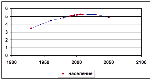 Рис. 2. График численности населения Финляндии. Составлено автором по источнику Данные рис. 2 позволяют сделать вывод о том, что численность Финляндии в период с 1930 г. по 2007 г. в целом возрастала. Темпы прироста населения с 1930 по 1960 гг. составила 0,9% в год, а позже с 1960 по 1990 гг. это показатель уменьшился и был равен 0,4%. После 2007 г. года показатели численности населения уже даны по прогнозам. И в период с 2007 по 2010 гг. численность населения уменьшилась, темпы прироста в этот период равнялись -0,2% в год. И в 2010 году численность населения Финляндии составила 5193690 млн. человек. К 2030 году население, по прогнозам составит 5201445 млн. человек. Но к 2050 снова вернется к отметке 4819615 млн. человек.