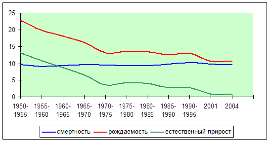 Рис. 3. Динамика естественного прироста населения (на 1000 человек) Из рисунка 3 видим, что рождаемость в Финляндии резко понижается, и если в 1950–1955 гг. она была на уровне 22,8%, то к 2004 году она понижается до отметки 0,9%. Смертность за весь рассмотренный период держится приблизительно на одном уровне 9,5%. Наибольший показатель смертности зафиксирован в 1990–1995 гг. и равен 10,2%, а наименьший показатель был в 1955–1960 гг. – 9,1%. Показатели естественного прироста так же резко понижаются в связи с резким понижением рождаемости. И, если в 1950–1955 гг. показатель естественного прироста был равен 13,1%, то к 2004 году этот показатель снизился до отметки 0,9%. Естественный прирост в городах и поселках заметно выше, чем в сельских местностях. Причиной является более высокая рождаемость на динамику населения в различных районах, оказывает влияние миграция, которую подразделяют на внутреннею и внешнею. Городское население быстро растет, а сельское население соответственно уменьшается. [9; 2]