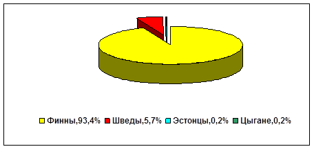 Рис. 10. Отраслевая структура занятости населения Финляндии. Составлено автором по источнику Подробно рассмотрев рисунок 10, мы видим, что наибольшая доля населения занята в отрасли услуг (33%). Это связано с большим потоком туристов в Финляндию, особенно во время праздников. Меньший процент населения занят в сфере добывающей и обрабатывающей промышленности и в сфере коммунальных служб (20,5%). На третьей ступени стоит сфера торговли, гостиничного и ресторанного бизнеса и составляет 14%. Низшую строчку в отраслевой структуре занимают другие сферы, 3,8%. Плотность населения Финляндии неоднородна. К примеру, в провинции Уусимаа на один квадратный километр приходится 250 человек, в других индустриальных южных провинциях – около 30 человек, в восточных и северных провинциях – менее 10 человек, а в Лапландии так и вовсе 2,2 человека на квадратный километр. Средняя плотность населения страны составляет 14 человек на 1 кв. км. На сельскую местность приходится 33% населения Финляндии, остальные 67% проживают в городах и посёлках городского типа. К северу от 65-й параллели проживает всего 10% населения страны. Этнические группы, входящие в состав населения, это: финны – 93, 4%, шведы – 5,7%, эстонцы – 0,2% и цыгане – 0,2%. Рис. 11. Этнические группы, входящие в состав населения. Составлено автором по источнику Население в основном концентрируется в прибрежных и южных районах Финляндии. Наиболее высокой плотностью населения отличается побережье Финского залива, юго-западное побережье возле Турку и некоторые районы, расположенные непосредственно к северу и востоку от Хельсинки – вокруг Тампере, Хямеэнлинны, Лахти и других городов, которые имеют связь по каналам и рекам с побережьем. Новейшие сдвиги в размещении населения тесно связаны с промышленным развитием внутренних районов. Многие центральные районы и почти весь Север остаются малонаселенными. [9] Расселение изучают с разных точек зрения, обращая внимание на внешний вид поселений, их размещение и группировку, функциональный характер построек или административно-иерархический статус. Статистика обычно выделяет сельское и городское расселение. В период до либерализации хозяйственной деятельности города являлись четко ограниченными единицами, в соответствии с действовавшим в то время в Финляндии положением о городах. С 1870-х годов начался рост новых крупных населенных пунктов наряду со старыми, редко расположенными городами, и границы между городом и деревней стали уже менее четкими.Городские функции стали выполнять многие промышленные центры и железнодорожные узлы, которые не всегда имели городские права, а иногда и не хотели их приобретать. Дело заключалось в том, что превращение поселка в город влекло за собой дополнительные обязанности и налоги для его жителей. Поэтому, начиная с 1859 г., складывался третий тип общины – поселок городского типа – кауппала. Он занимал промежуточное место между городской и сельской общинами. В начале 1976 г. в Финляндии насчитывалось 25 таких поселков. Спустя год все они были преобразованы в города. Кроме того, в период 1898–1955 гг. в Финляндии существовали еще так называемые густонаселенные общины. Они были отделены от сельских общин и имели некоторые права, хотя и не обладали полной самостоятельностью. Жители, например, платили налоги сельским общинам, в состав которых о