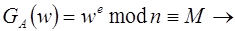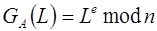 то есть Пара G = (e,n) публикуется в качестве открытого ключа RSA (RSA public key). Пара N = (d,n) играет роль секретного ключа RSA (RSA secret key) и держится в секрете. Число n называется модулем, а числа e и в - открытой и секретной экспонентами, соответственно. Допустим абонент В хочет послать сообщение абоненту В по коммутационному каналу. Сообщением являются целые числа лежащие от 0 до n-1, Алгоритм шифрования: Берется открытый ключ (e,n) стороны A, вставляется открытый текст L, передается шифрованное сообщение: