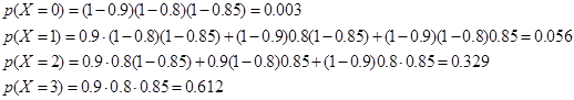 25. Три плавбазы вышли на путину. Вероятность того, что первая из них перевыполнит план равна 0,9; вторая – 0,8 и третья – 0,85. СВ Х – число баз, перевыполнивших план. Случай ная величина Х может принимать такие значения Х=0 если ни первая ни вторая ни третья базы не перевыполнили план Х=1 – это может произойти если 1-я база перевыполнила план, а вторая и третья нет, или вторая перевыполнила а первая и третья нет, или третья первыполнила а первая и вторая нет. Х=2 –если первая и вторая базы перевыполнили план а третья нет, или вторая и третья перевыполнили а первая нет, или первая и третья перевыполнили а вторая нет. Х=3- если все три базы перевыполнили план . Найдем их вероятности.