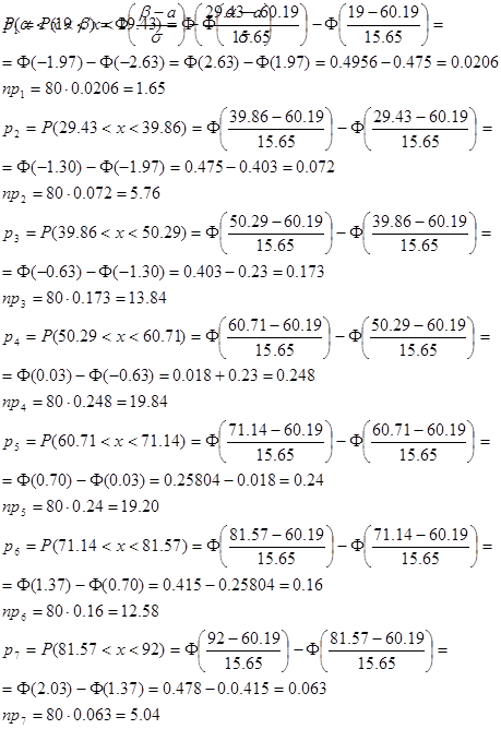 По формуле Бернулли вероятность того что случайная величина в n=4 испытаниях m=2 раза попадет в интервал равна е)Графики смотри рис.2(35) 41-50. Дана выборка значений признака Х. Требуется: 1) построить статическую совокупность; 2) построить гистограмму частот; 3) найти точечные оценки генеральной средней, генеральной дисперсии и генерального среднего квадратического отклонения; 4) найти доверительный интервал для неизвестного математического ожидания; 5) проверить нулевую гипотезу о нормальном законе распределения количественного признака Х генеральной совокупности. 41. 38, 51, 57, 64, 76, 92, 89, 19, 35, 60, 22, 41, 44, 48, 60, 44, 67, 80, 86, 57, 25, 83, 73, 70, 70, 70, 64, 60, 60, 64, 57, 54, 57, 54, 32, 86, 86, 80, 76, 60, 76, 70, 70, 67, 67, 64, 64, 60, 28, 67, 41, 41, 51, 48, 44, 80, 80, 76, 73, 51, 67, 60, 32, 41, 41, 54, 57, 60, 67, 73, 73, 76, 57, 67, 73, 73, 64, 60, 54, 57. 1) Объем выборки n=80 Наименьшее значение признака Х