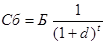 де С – сьогоднішня сума грошей, що інвестуються; d – постійна норма дисконту, що дорівнює прийнятій для інвестора нормі прибутку на капітал; t – тривалість розрахункового періоду (в роках); Сьогоднішня цінність Сб майбутніх грошей визначається таким чином: