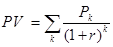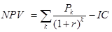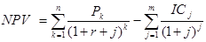 Перерахунок поточних і майбутніх сум в еквівалентній вартості шляхом дисконтування дозволяє визначити цінність проектів на основі поточних і майбутніх витрат і результатів. Підраховані за кожний рік життя проекту, вони дисконтуються, а потім підсумовуються з метою одержання загального показника цінності проекту, на основі якого роблять висновок щодо прийнятності проекту. Критерії, що використовуються в аналізі інвестиційної діяльності, можна підрозділити на дві групи в залежності від того враховується чи ні часовий параметр: 1) засновані на дисконтованих оцінках; 2) засновані на облікових оцінках. До першої групи відносяться критерії: - чистий приведений ефект (Net Present Value, NPV); - індекс рентабельності інвестиції (Probability Index, PI); - внутрішня норма прибутку (Internal Rate of Return, IRR); - модифікована внутрішня норма прибутку (Modified Internal Rate of Return, MIRR); - дисконтований строк окупності інвестиції (Discounted Payback Period, DPP). До другої групи відносяться критерії: - строк окупності інвестиції (Payback Period, PP); - коефіцієнт ефективності інвестиції (Accounting Rate of Return, ARR). а) Метод розрахунку чистого приведеного ефекту Цей метод заснований на зіставленні величини вихідної інвестиції (IC) із загальною сумою дисконтованих чистих грошових надходжень, генерованих нею протягом прогнозованого періоду. Оскільки приплив коштів розподілений у часі, він дисконтується за допомогою коефіцієнта r, встановлюваного інвестором самостійно виходячи зі щорічного відсотка повернення, який він хоче чи може мати на інвестований їм капітал. Припустимо робиться прогноз про те, що інвестиція (IC) буде генерувати протягом n років річні доходи в розмірі Р1 , Р2 , …, Рn . Загальна накопичена величина дисконтованих доходів (Present Value, PV) і чистий приведений ефект (Net Present Value, NPV= ЧДД –чистий дисконтований доход) відповідно розраховуються по формулах [13]: