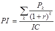 де j – прогнозований середній рівень інфляції. При розрахунку NPV, як правило, використовується постійна ставка дисконтування, однак при деяких обставинах, наприклад, очікується зміна рівня дисконтних ставок, можуть використовуватися індивідуалізовані по роках коефіцієнти дисконтування. Якщо в ході імітаційних розрахунків приходиться застосовувати різні коефіцієнти дисконтування, то формула (1.5) не застосовується, і проект прийнятний при постійній дисконтній ставці може стати неприйнятним. б) Метод розрахунку індексу рентабельності інвестиції Цей метод є по суті наслідком попереднього. Індекс рентабельності (PI) = ІД(індекс доходності) розраховується по формулі [ 20 ]: