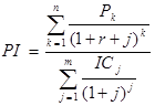 Якщо PI>1, то проект варто прийняти; якщо PI<1, то проект варто відкинути; якщо PI=1, то проект є ні прибутковим, ні збитковим. Якщо проект припускає не разову інвестицію, а послідовне інвестування фінансових ресурсів протягом m років, то формула для розрахунку PI. модифікується в такий спосіб (з врахуванням впливу інфляції як на дисконтовані потоки інвестиції, так і на сгенеровані потоки прибутку інвестиційного проекту):