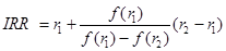 За допомогою таблиць вибираються два значення коефіцієнта дисконтування r1 <r2 таким чином, щоб в інтервалі (r1 , r2 ) функція NPV=f(r) змінювала своє значення з “+” на “-” чи з “-” на “+”. Далі застосовують формулу