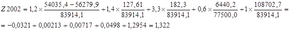 де Х1 = (Поточні активи - Поточні пасиви) / Обсяг активу; Х2 = Нерозподілений прибуток / Обсяг активу; Х3 = Прибуток до виплати відсотків / Обсяг активу; Х4 = Ринкова вартість власного капіталу / Позикові засоби; Х5 = Виторг від реалізації / Обсяг активу; При Z < 1,8 - імовірність банкрутства дуже висока; 1,8 < Z < 2,7 - імовірність банкрутства середня; 2,7 < Z < 2,99 - імовірність банкрутства невелика; Z > 2,99 - імовірність банкрутства незначна. Розрахунок інтегрального показника Альтмана за даними балансу СП ЗАТ з ІІ «КИПАРИС» за 2002 рік, дає наступні значення: