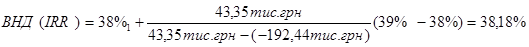 В табл. 3.9, 1.Б, 2.Б наведені розрахунки в “електронних таблицях” EXCEL-2000 послідовними приближеннями значення ВНД – внутрішньої норми доход-ності, тобто такого значення % зміни вартості грошей у часі, яка дозволяє вирів-няти дисконтовані інвестиції та чистий дисконтований доход підприємства, тобто ВНД – досягнута фактична рентабельність капіталу. За результатами наближень табл.1.Б,2.Б (Додаток Б) внутрішня норма дисконтування проекту розраховується як: