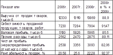 Трудоемкость за анализируемый период изменилась. В 2006 году на одного человека приходилось 168,9 тыс. руб., а в 2008 году – 192,62 тыс. руб. валовой продукции. Следовательно, трудовые ресурсы стали использоваться менее эффективно. Для оценки деловой активности организации за исследуемый период необходимо проанализировать финансовые результаты её деятельности, которые представлены в таблице 6 (Рис 6). Таблица 6 – Финансовые результаты деятельности организации
