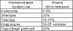 3.2.1 Расчет численности вспомогательных рабочих и РСС 1.К вспомогательным рабочим относятся контролеры ОТК, кладовщик, слесари-ремонтники, электрики, подсобные рабочие. Расчет численности вспомогательных осуществляется по нормам обслуживания. За основу принимается количество объектов, обслуживаемых одним вспомогательным рабочим. Объектом обслуживания являются производственные участки оборудования и основные рабочие, по которым устанавливаются нормы обслуживания для профессий вспомогательных рабочих (Таблица 10). Таблица 10 – Укрупненные нормы обслуживания одним вспомогательным рабочим