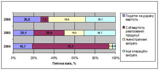 Рис. 2.1. Динаміка собівартості продукції Відкритого акціонерного товариства "Енергія" Витрати на виробництво (В) можна відобразити як суму трьох елементів виробничого процесу: матеріальних витрат (М), амортизації (А) та заробітної плати з нарахуваннями (З). Оцінити якою мірою вплинув кожен чинник на зміну рівня загальних витрат на виробництво 1 грн. виготовленої продукції можна на підставі формули: В/Q = М/Q + А/Q + З/Q (2.1.) На підставі даної формули можна оцінити якою мірою кожен чинник вплинув на зміну рівня загальних витрат на виробництво 1 грн. виготовленої продукції [4, c.156]. Аналіз табл.2.1. (Додаток Г) дозволяє зробити такі висновки. Витрати на виробництво у порівнянні з 2005 роком зменшилися на 68,3 тис грн., що у відносному вимірі становить 12,48 %. Загалом за 2 роки витрати зменшилися на 149,9 тис грн., а у відносному вимірі на 23,84 %. Значне зменшення витрат на виробництво у аналізованому періоді пояснюється зменшенням обсягу виробництва, яке також зменшилося на 53,68 %. Найбільший вплив на темп зниження витрат на виробництво спричинили матеріальні витрати (-41,84% ), а найменший – витрату на оплату праці (-11,98 %). Загальні витрати на 1 грн. виготовленої продукції загалом за 2 роки витрати зросли на 12,47 коп. Це може свідчити про те, що обсяг виробництва зменшувався більш випереджальними темпами аніж витрати. Також зростання витрат було зумовлено зростанням витрат на 1 грн. виготовленої продукції на оплату праці ( зросли на 8,7 коп.), на амортизацію (зросли на 2,3 коп.) та на матеріальні витрати (1,47 коп.). Проте, якщо порівнювати 2006 рік з 2005, бачимо що ситуація почала змінюватися, адже загальні витрати на 1 грн. виготовленої продукції зменшилися на 12,39 коп., при чому матеріальні витрати на виробництво на 1 грн. виготовленої продукції зменшилися на 5,03 коп., витрати на оплату праці на 1 грн. виготовленої продукції – на 4,7 коп. та амортизація на 2,67 коп. Сукупний вплив цих факторів і спричинив зменшення витрат у 2006 році. Також, як видно з табл. 2.1. (Додаток Г), спостерігалося зниження частки амортизаційних відрахувань може свідчити про зміню технічного рівня виробництва або ж методів нарахування амортизації. Зросла частка витрат на оплату праці, отже зросла трудомісткість продукції. Зменшення питомої ваги матеріальних витрат могло бути обумовлено зростанням продуктивності праці або зміною складу і структури продукції. У загальній сумі витрат підприємства найбільшу питому вагу займають адміністративні витрати (36,6%). Їх частка впродовж періоду зросла з 3,3 % до 36,6 %. Це є негативним фактором і може бути спричинене підвищенням оплати праці адміністративно-управлінського персоналу, збільшенням витрат на відрядження, зв’язок тощо. Собівартість реалізованої продукції значно зменшилася а аналізованому періоді і становить 7,5%. Зменшення її суми та частки не є заслугою підприємства, адже зумовлене значним скороченням обсягу виробництва. Інші операційні витрати зменшилися на 25,9 тис. грн., а їхня частка на 1,6 процентних пункти. Такі зміни можна пояснити скороченням інших операційних доходів. Сума податку на додану вартість за 2005 рік зросла на 55,7 тис грн., проте загалом в аналізованому періоді зменшилася на 290,6 тис грн., що пов’язано із зменшенням виручки від реалізації. Наочно структура витрат підприємства наведена на рис.2.2.
