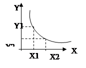 рис.3 Властивості кривих байдужості: а) криві байдужості є монотонно спадними функціями; б) криві байдужості не перетинаються Очевидно, що поверхня байдужості, яка містить набір (Y,X), не буде проходити в областях А та С оскільки ці області містять кращі та гірші набори благ 1 та 2 . Методом вилучення ми дійшли висновку, що можливими областями, через які проходитиме поверхня байдужості, яка містить набір (Y, X), можуть бути лише області B та D, тобто вона є монотонно спадковою функцією. 2. Поверхні байдужості не перетинаються. 3. При збільшенні споживання певного блага зменшується величина іншого, яку людина жертвує заради отримання додаткової одиниці першого блага (прояв закону спадної граничної корисності). Якщо у людини, наприклад, багато одягу, але мало їжі, то заради додаткової одиниці їжі вона схильна пожертвувати значною часткою одягу. Якщо ж людина має багато їжі, то заради додаткової одиниці їжі вонабуде схильна жертвувативжеменшою часткою гардеробу. На графіку видно, що кут нахилу поверхні байдужості до горизонтальної осі зменшується при збільшенні споживання блага, величина якого відображається на цій осі. Рис. 4.