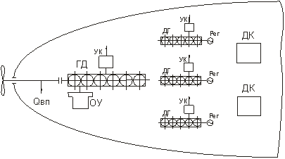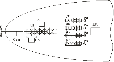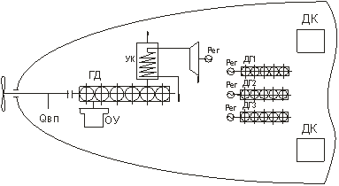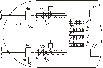 Задача №1 Судно-постачальник для перевозки широкої номенклатури вантажів в арктичних широтах оснащено одновальною дизельною установкою потужністю Neгд . До складу СЕУ входять три дизель-генератори потужністю по Ре кожен, два допоміжні котли , один утилізаційний котел головного двигуна (ГД) та три утилізаційні котли дизель-генераторів (ДГ), утилізаційна водоопріснювальна установка (ОУ) типу Д. Прийняти такі дані: ККД ГД – 0,5; ККД ДГ – 0,48; допоміжного котла – 0,81; УК ГД – 0,41; УК ДГ – 0,2; ОУ – 0,3; витрати теплоти з газами ГД 0,27; ДГ – 0,29; з прісною водою ГД – 0,1; температура питної води – 50о С. Розробити структурну схему, скласти таблицю режимів роботи СЕУ, визначити ККД та КВТ на ходовому режимі. Зіставте кількість пари, що випрацьовують допоміжний та утилізаційний котли. Недостатні для розрахунків показники призначимо самостійно: