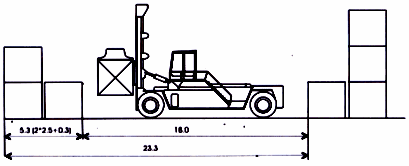 Рис.18. Организация штабеля фронтальным погрузчиком Эти машины используются самостоятельно или в различных комбинациях, поэтому обычно говорят о применении определенных машин для тех или иных схем механизации перегрузки контейнеров. Существуют основные схемы механизации перегрузки контейнеров на сортировочной площади с использованием: тягачей и полуприцепов, портальных погрузчиков, портальных погрузчиков и тягачей с полуприцепами, мобильных козловых кранов (на пневмоходу) и тягачей с полуприцепами, мостовых перегружателей и тягачей с полуприцепами, мостовых кранов и тягачей с полуприцепами, фронтальных погрузчиков, оборудованных контейнерным захватом. Для схемы с использованием тягачей и полуприцепов характерно применение только в пределах перегрузочного комплекса мощных тягачей (как правило, с подъемным опорно-сцепным устройством) и магистральных или упрощенных полуприцепов. При этом контейнер всегда находится на полуприцепе. Схема механизации исключительно проста по технологии и организации работ. Применяемая техника отличается надежностью в эксплуатации. Техническое обслуживание и ремонт тягачей и трейлеров достаточно просты и не требуют наличия персонала высокой квалификации. Повреждаемость контейнеров незначительная. Стоимость покрытия сортировочной площади низкая, так как покрытие легкое. Вместе с тем необходимы большое число полуприцепов, что дорого, и большая территория для размещения контейнеров на полуприцепах, а также порожних контейнеров. Схема с использованием портальных погрузчиков получила наибольшее распространение. Захватное устройство портального погрузчика размещено по его продольной оси и удерживает контейнер сверху. Поэтому контейнеры располагаются на площадках длинными рядами (торцами друг к другу), вдоль которых движется погрузчик. Дорожки для опор погрузчика отделяют ряды друг от друга. Ряды группируются в блоки, между которыми устанавливаются проезды. Чтобы передвижения погрузчика были минимальными, ряды располагают перпендикулярно линии причала. Длина ряда обычно составляет около 100 м. Наибольшая высота штабелирования - 4 яруса. Схема с использованием портальных погрузчиков отличается высокой эксплуатационной гибкостью, так как в технологической линии на сортировочной площади используются машины только одного типа и эти машины автономны и отличаются высокой маневренностью. На один причальный перегружатель с учетом выполнения всех работ на комплексе требуется не более шести портальных погрузчиков. Численность персонала, обслуживающего два причальных перегружателя, - 22 чел. Капиталовложения в создание комплекса (с учетом необходимости тяжелых покрытий и высокой стоимости погрузчиков) считаются умеренными (средними). Однако эксплуатационные расходы оказываются высокими из-за недостаточной надежности и короткого срока службы машин, а также необходимости в высококвалифицированном персонале для их эксплуатации и ремонта. Эта схема особенно удобна для перегрузочных комплексов с повышенной долей импортных контейнеров в грузопотоке. Схема с использованием портальных погрузчиков и тягачей с полуприцепами отличается от описанной выше тем, что портальные погрузчики используются только для формирования и разборки контейнерного штабеля на сортировочной пло
