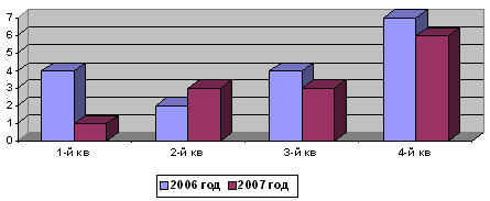 Из проведенных расчетов видно, что наблюдается тенденция к снижению травматизма. А наибольшие пики травматизма отмечаются в первом, третьем и четвертом кварталах за 2006 год. А в 2007 году, во втором, третьем и четвертом квартале. Что касается положительной тенденции по снижению пострадавших от несчастных случаев, то результатом снижения послужила проводимая предприятием политика, направленная на улучшение качества осведомленности в вопросах техники безопасности, а также в области организационно - технических нововведений. |