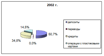 Рис. 2.2. Структура отделов ОАО «Дальневосточный коммерческий банк «Далькомбанк» Биробиджанский филиал Если проанализировать деятельность данного филиала за последние 2 года то можно сказать, что количество операций банка растет. До 2003 года банк работал только с двумя видами валют – рубли и доллары, а с 2003 года начали работать с ЕВРО. Так же в 2003 году появилась такая услуга как денежные переводы WESTERNUNION. В 2002 году банк предложил своим клиентам два новых вида вкладов – «Отпускной накопительный» и «Юбилейный». Так же за последние два года повышается спрос на такие услуги, как «Зарплатный проект», кредиты по «Зарплатному проекту», получение студентами стипендий по пластиковым картам. Если рассматривать рост прибыли за 2002-2003 г. за счет введения новых услуг, то можно сказать что в 2003 г. получено на 21,5% прибыли больше, чем за 2002 год. Если анализировать каждое направление работы банка с физическими лицами, то можно сказать, что основной доход банк получает от принимаемых депозитов и от выдаваемых кредитов (рис. 2.3.).