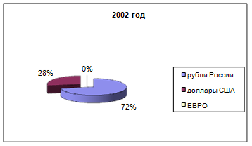 Если проводить анализ принятых вкладов «Отпускной накопительный» от населения в различной валюте, то можно сказать, что ЕВРО во вклады стали приносить только в 2003 году, но в сравнении в другими валютами их доля очень мала – всего 3 % (рис.2.5). Возросла так же популярность вкладов в долларах США (на 10%), но рубли России все равно занимают больший процент в общем объеме вкладв.