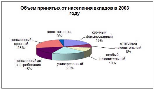 Если сделать анализ всех принятых вкладов от населения в 2003 году, то мы видим следующее: самым востребованным вкладом является пенсионный срочный. Это можно объяснить тем, что в нашей области много военных пенсионеров, которые уходя на пенсию еще в молодом возрасте (40-50 лет) устраиваются на хорошо оплачиваемую работу, а назначенную им пенсию вносят на срочные вклады под хорошие проценты. Это взаимовыгодно – банк вкладывает деньги в доходные операции (в частности кредитование), а клиент получает доход в виде процента. Примерно равны по объему срочный фиксированный и универсальный вклады – 19, 20%. Это объясняется тем, что по срокам – это среднесрочные вклады, пролонгируемые, «универсальный вклад» удобен еще и тем, что операции по счету можно совершать с использованием банковской карты ОАО Далькомбанк «Золотая корона». Рейтинг вклада «особый накопительный» составляет 10%. Возможно клиентов банка не устраивает большой срок хранения – 370 дней. «Отпускной накопительный» вклад недавно на рынке г. Биробиджана и поэтому я думаю, что в самое ближайшее время он станет очень популярен среди клиентов банка. Вклад «золотая рента» имеет самый низкий процент. Это можно объяснить тем, что высок первоначальный взнос.