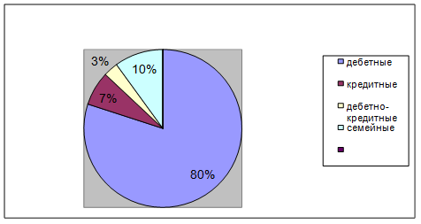 Рис. 2.9. Объем различной валюты на депозитах физических лиц В рыночных условиях коммерческие банки должны уделять серьезное внимание привлечению ресурсов и для этого: · разрабатывать собственную депозитную политику; · особое внимание в процессе осуществления депозитной политики уделять срочным вкладам; · разнообразить виды вкладов; · расширять банковские услуги для привлечения потенциальных вкладчиков; · проводить эффективную процентную политику, не снижающую доходность банка и обеспечивающую определенную привлекательность для вкладчиков. Пластиковые карты. Банковская пластиковая карта – это одна из разновидностей финансовых карт, которая является персонифицированным платежным средством, предназначенным для оплаты товаров, услуг и получения наличных денежных средств в банках и банковских автоматах (банкоматах). КБ «Далькомбанк» выпускает пластиковые карты Далькомбанк «Золотая корона». Банковская карта «Золотая корона» - средство для составления расчетных и иных документов, подлежащих оплате за счет ее пользователя. Пользование банковскими картами Далькомбанка «Золотая корона» регулируется законодательством РФ. Банковская карта является собственностью банка и подлежит возврату по окончании срока ее пользования. Пользователем карты является лицо, на имя которого Банком зарегистрирована карта в платежной системе. По способу записи информации карты, выпускаемые Далькомбанком – это карты с магнитной записью и микропроцессорные. Магнитная запись является одним из самых распространенных сегодня способов нанесения информации на пластиковые карты. Особенно популярна она в платежных системах. Однако магнитная полоса не обеспечивает необходимого уровня защиты информации от мошенничества и подделок, а это очень важно в платежных и банковских системах, основанных на картах. По характеру взаимодействия со считывающим устройством это контактные карты (непосредственный контакт со считывающим устройством). Микропроцессорная карта хранит информация о пользователе непосредственно на самой карте и поэтому обеспечивает возможность формировать транзакции в терминалах и банкоматах системы «Золотая корона» без непосредственного доступа к счету пользователя (режим OFF-Line) По общему назначению – пластиковые карты для финансовых операций (расчетов). По эмитентам – банковские (универсальные) карты, выпускаемые банками и финансовыми компаниями. По техническим особенностям – «ключ к счету» - средство идентификации владельца счета, ведущегося у эмитента. В зависимости от экономического содержания операций по карте: – дебетные. Держатель дебетной карты должен заранее внести на свой счет в банке-эмитенете некоторую сумму. Её размер и определяет лимит доступных денежных средств. При осуществлении расчетов с использованием карты синхронно уменьшается и лимит. Контроль лимита осуществляется при проведении авторизации, которая при использовании дебетовой карты обязательна всегда. Для возобновления (или увеличения) лимита держателю карты необходимо вновь внести средства на свой счет; – кредитная – позволяет клиенту рассчитываться по карте в пределах лимитов, установленных Банком, с начислением на сумму займа процентов по кредиту и возможностью возобновления кредита по мере погашения задолженности; – дебетн