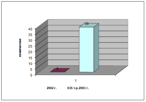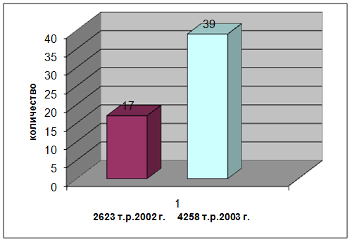 Рис. 2.13. Количество выданных кредитов под залог иностранной валюты Анализируя диаграмму на рис. 2.13. можно сказать, что в 2003 году предоставлено под залог иностранной валюты на 22 кредита больше, по сравнению с 2002 годом. А если смотреть по сумме выданных кредитов, то она на 62% превышает сумму 2002 года.